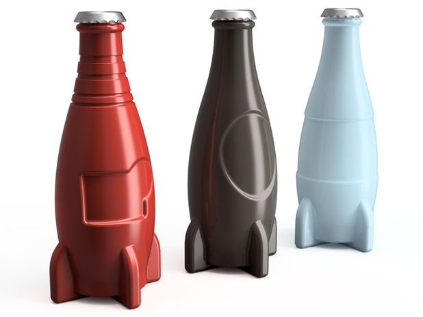 The bottles were 3D modeled in Autodesk Fusion 360 and printed on an FDM printer. The standard and "Cherry" variants were painted with opaque acrylics to match their in-game appearance. For the Nuka-Cola Quantum variant, the bottle was printed in transparent filament and features a custom-made internal enclosure housing eight white LEDs to achieve its signature glow. This shell was then painted with a white base and light blue transparent paint to effectively diffuse the internal lighting.